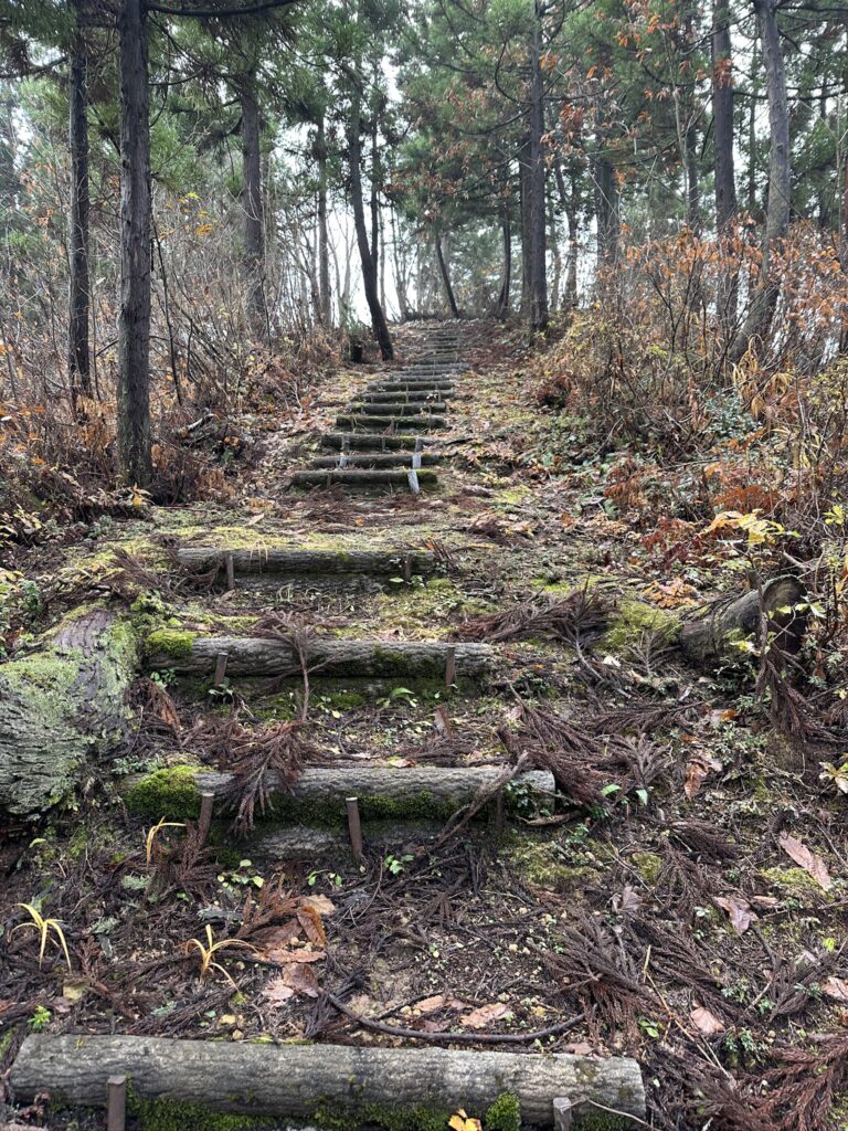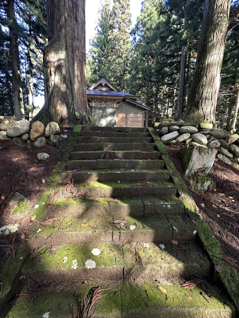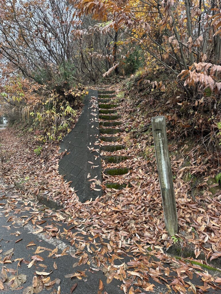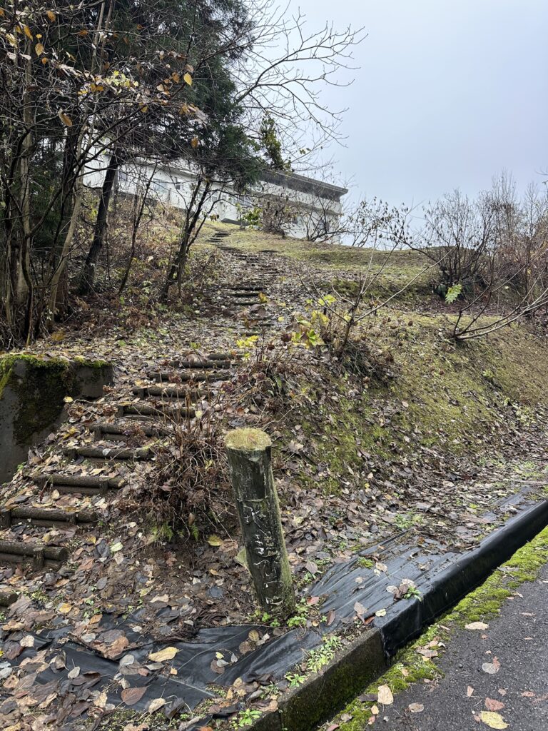やまびこ荘という温泉旅館のすぐ近くにありますが、この写真の階段を登っていったらやまびこ荘の従業員が作業している建物の裏側に出そうだったのでやめました。